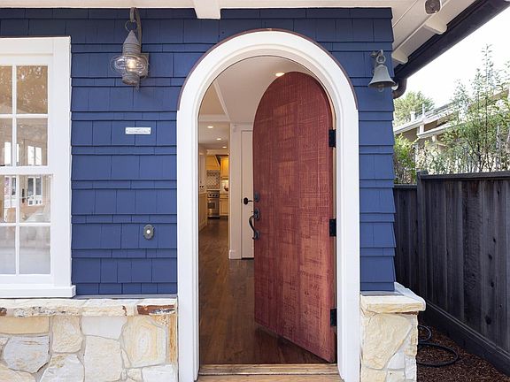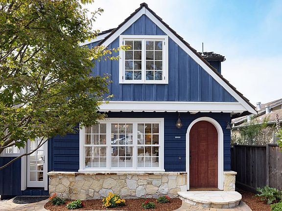 The residence offers three bedrooms, each with an en-suite full bathroom, plus a powder room conveniently located off the kitchen. High ceilings and abundant windows fill the interiors with natural light. An elevated side deck is a wonderful venue to enjoy the afternoon sun, while the backyard centers around a majestic sequoia tree and Carmel Stone fireplace, perfect for evenings outdoors in good company.
