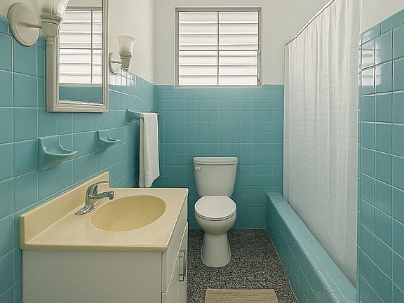 Bathrooms- 1 bathroom in its original mid-century style design with shower head, sink and a small walk-in closet. There is a 1/2 bathroom located near the kitchen with sink and toilet for your guests.