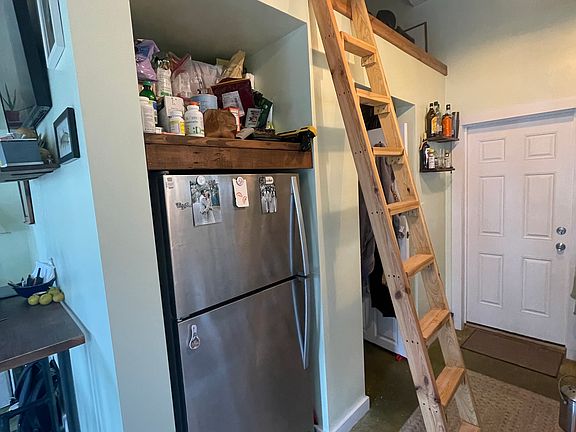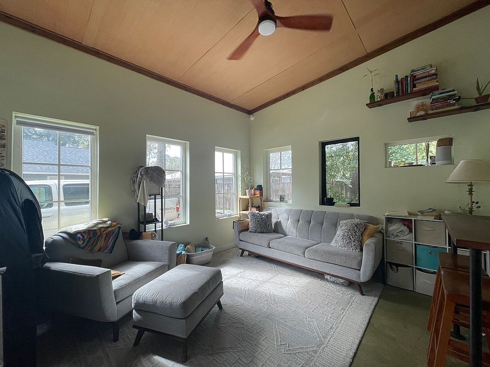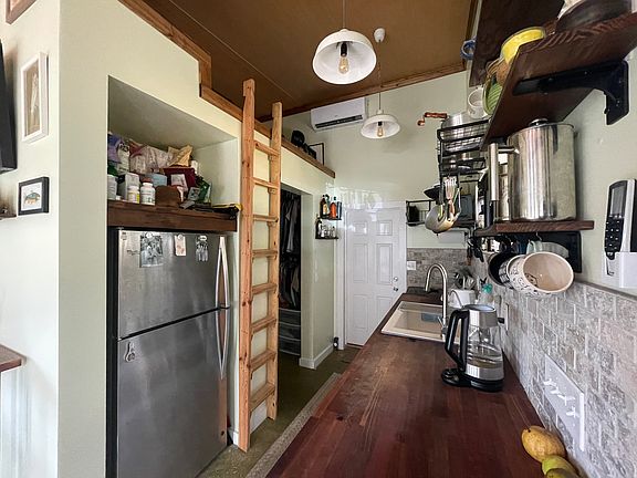 There is a loft with a ladder where any size mattress you'd like will fit. Optionally, you can have a bed downstairs (we had a queen sized bed along with a couch in the living space when we had a newborn. Not a whole lot of floor room left but enough to walk around no problem). I personally built this home in '23 and know everything there is to know about it. We've only lived in it for a year, no pets. Stained concrete floors throughout except for the loft which has a plush rug and the bathroom which is tiled. Very nice tiled shower done by a professional (not me). Everything here was built for my wife and I, who are both moderately tall individuals (5'10" and 6'1" respectively). The counters, kitchen sink, and kitchen table (which doubles as my standing desk) are tall oriented. We like chopping in an upright position instead of bent over like a normal house. There's a large covered porch with a fan that is wonderful from fall to spring and alright on summer mornings and evenings. I own the house next door as well, and there is a vegetative fence growing to separate the two lots. There is no fence separating you from the quiet street out front. So be aware if you have a pet.