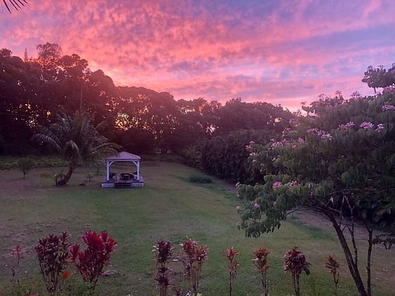 Lovely furnished gazebo, placed in the expansive lawn area.