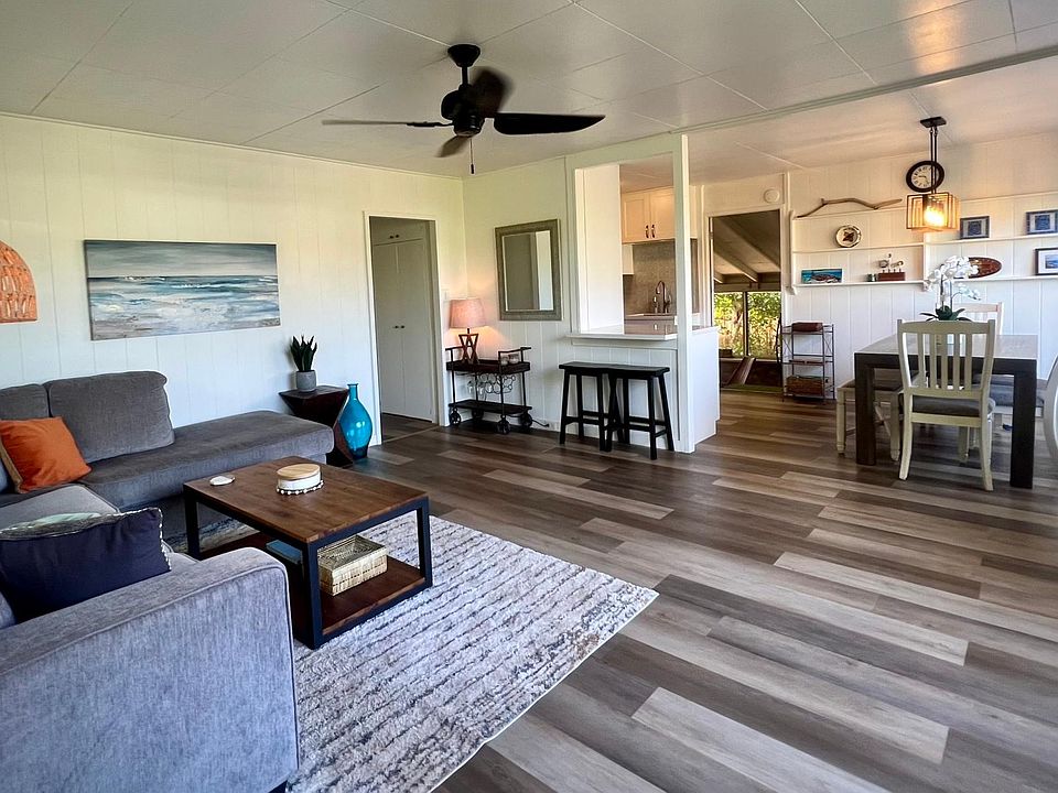 Fully furnished home in a quiet, beachside neighborhood in Haleiwa for rent beginning mid November. It's only two houses back and a two minute stroll from a beautiful beach with stunning sunsets. There's a home office, 600mbps fiber optic WiFi, and Roku TV. It comes with linens and kitchenware. The property is gated and all yours. It has a laundry room, carport, outdoor shower, backyard shaded w/fruit trees - citrus, guava, papaya, and Suriname cherry, as well as aloe plants - and a patio with a dining table, grill, and sink. Only a 15-minute walk along the beach or five-minute drive to Haleiwa Harbor and a 20-minute drive to Schofield.