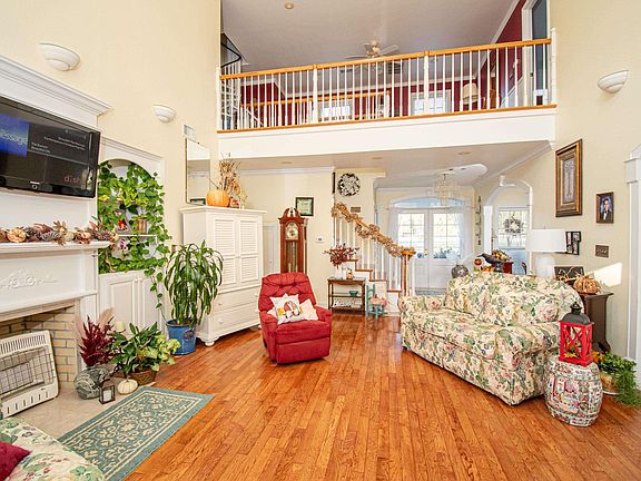 Rare and Spacious Home with Unique Features on 1.4 Acres! This rare home offers a spacious layout with character and custom details on 1.4 green acres dotted with mature trees. Enter through the front door and be greeted by hardwood floors, an elegant staircase, and soaring ceilings that create an open feel. The living room features a gas fireplace, large windows, and doors leading to a cozy patio. The kitchen, next to the living room, has an island, built-in appliances, and a custom pantry with pull-out shelves. It also includes a separate porch entrance. The laundry room is off the kitchen and leads to the garage that has built-in cabinets and a bonus room above, ideal for storage or work space. Pre-Approval Letter required. Downstairs includes a formal dining room for entertaining and a half bath. The main-floor master suite has a sitting area, private porch access, and a walk-in closet with built-ins. The en suite bath has a jacuzzi tub, enclosed shower, dual sinks, and plenty of storage. Upstairs are three bedrooms, one with an en-suite bath. A hallway bath has double sinks and a vanity. A spiral staircase leads to a third-story bonus room that could be an extra bedroom.