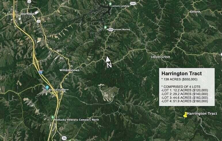 This tract of land offers 41.4 acres located 5 miles southeast of Williamstown, KY*Beautiful rolling acreage with woods, grass fields, wildlife and multiple creeks*Underground electric and city water are easily accessible*Each lot has an elevated cleared field that would make for a quiet and secluded home site*This location is only 10 minutes from I-75, but secluded enough that you feel like you're truly away from it all!
