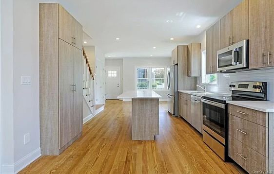 Laundry roomCabinets w stone islandHardwood floorsModern kitchen