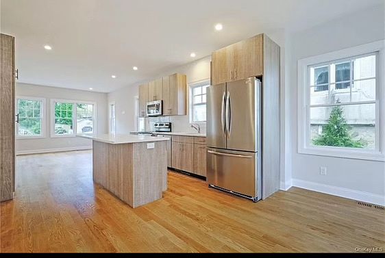 Hardwood floors, Deck, Fenced back yard. Beautiful modern kitchen with cabinets w stone island & a deck off kitchen looking over backyard. Stainless steal appliances.