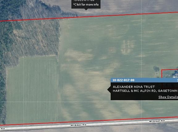 Approximately 78 Acres of Prime Vacant Land - Corner of Hartsell Rd and McAlpin Rd. Don't miss this rare opportunity to own a beautiful 78-acre parcel featuring a mix of woods and productive farmland. This versatile property includes approximately 17 acres of mature woods and 61 acres of tillable ground, some of which is tiled for improved drainage. The farmland is currently rented through the end of the year. This property offers a great balance of recreational and agricultural use, with ample road frontage and potential future building sites (subject to township/county approvals). Please do not walk the property without prior permission.
