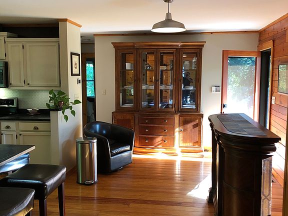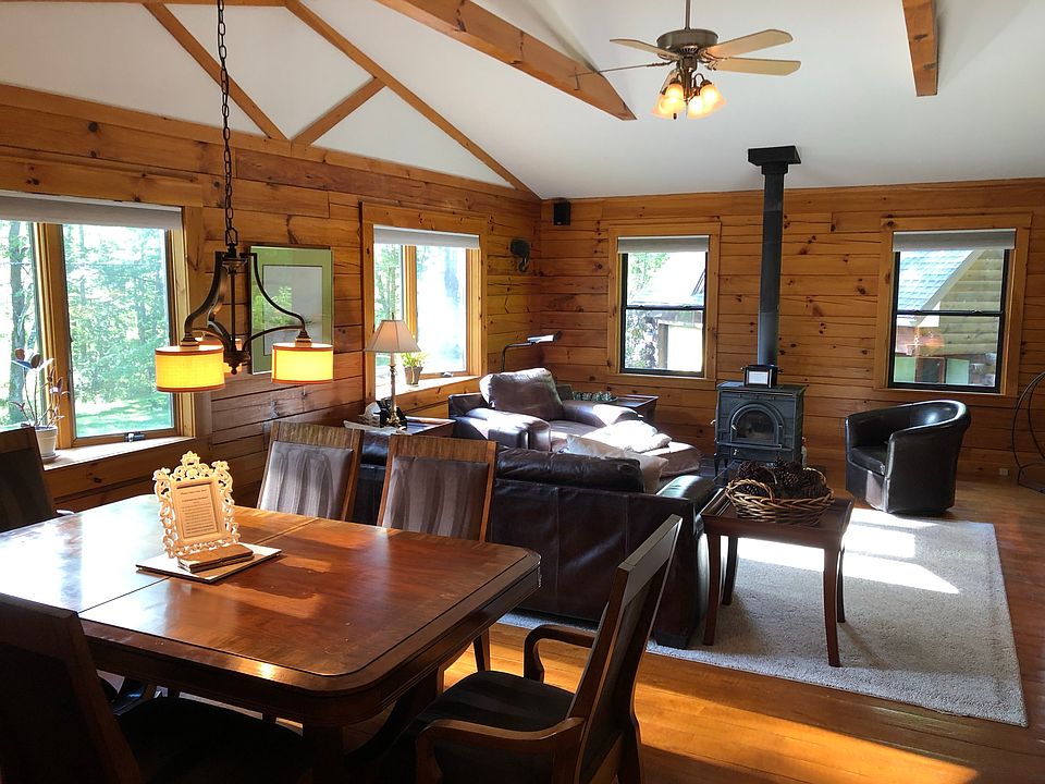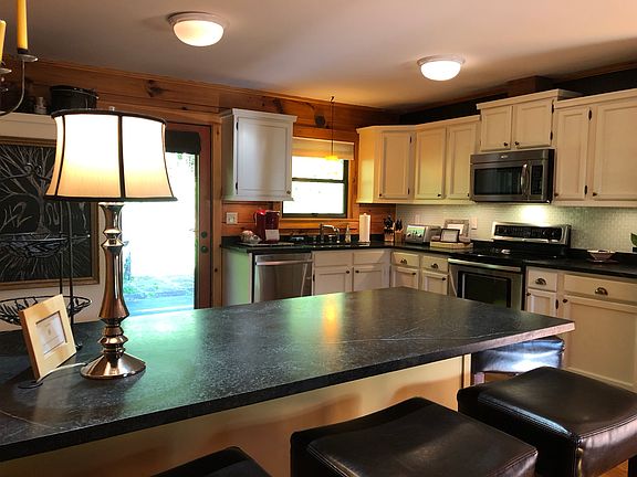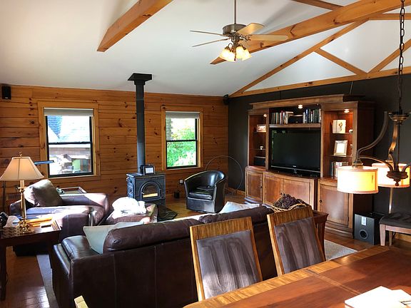 The recently renovated kitchen is complete with soapstone countertops, skylights (new photos pending), glass tile backsplash and all stainless appliances, including a wine refrigerator. A large center island with seating provides ample workspace as well as a gathering place during meal preparations. The first of two bars provides an additional gathering spot. The combined dining and living room features bay windows and a beamed cathedral ceiling. A large dining table comfortably seats 8 and leather living room furniture is centered on a wood stove and RokuTV with surround sound. The game room features a classic slate pool table, wood paneled fireplace with thermostat-controlled propane stove, a large wet bar with beverage refrigerator, a 60" TV with premium surround sound and ample seating.