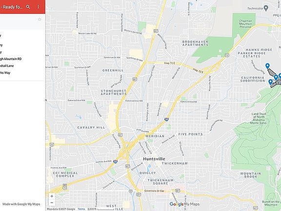 Mountain Land available for sale. Excellent Location for custom homes! This is one of the last large tracts of land within 3 miles of downtown Huntsville Alabama, which has one of the highest growth rates in the U.S. Huntsville is #1 in the nation for 2021 Economic Growth. Located on Chapman Mountain only 5 minutes to downtown with Excellent access to all directions. Click "read More" button below to see full description..........This property would be ideal for larger 2, or 5 acre Executive Home building sites, but could also accommodate over 225 smaller homesites. Excellent potential for those who love Nature and desire direct access to many trails in the Land Trust and Monte Sano Trail System. This property is perfect for a Residential Development and accessible from Hawks Way and/or High Mountain Road and/or Redtail Lane. Easy access from I-565 and HWY 72 East, Saddletree Blvd, Oakwood Ave., or Harris Hills Blvd. Surrounded on 3 sides by Land Trust property this goes all the way up to the Land Trust at Bankhead Parkway.
