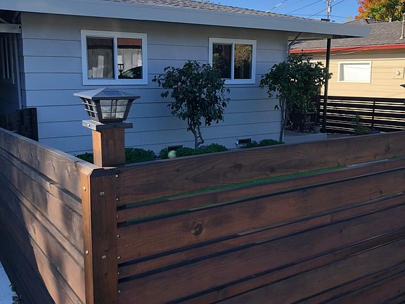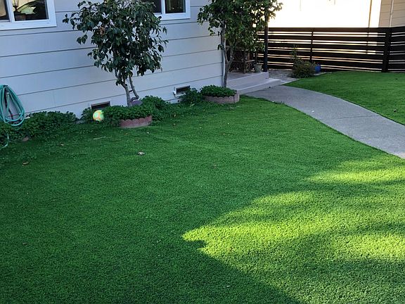 artificial grass to accommodate the city's water restrictions but still look beautiful, and a solid redwood fence surrounding the home to allow for privacy and comfort. The backyard includes
