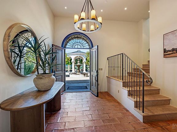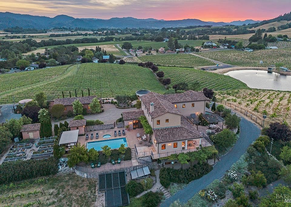 Perched atop a sun-kissed knoll in the rolling hills of Healdsburg just minutes from the famed Plaza, this breathtaking gated estate radiates the timeless romance of the Italian countryside. Sweeping 360 views of vine-draped valleys and golden hills create a setting straight from a Tuscan dream. The main residence is a harmonious blend of rustic charm and modern luxury, with warm stucco walls, clay tile roof, and stone paths winding through fragrant gardens and olive trees. Inside, soaring ceilings, a private elevator, butler's kitchen, and wine cellar evoke refined living. French doors open to patios perfect for dining under the stars, while the sparkling pool, spa, and full bath changing room invite leisurely afternoons. A 1-bedroom guest cottage offers serene vineyard views and private repose. Across 23.5 acres, life flourishes with vegetable and flower gardens, fruit trees, and two chicken coops. This is a place to gather, savor, and dream where every detail whispers romance, rooted in the heart of wine country.