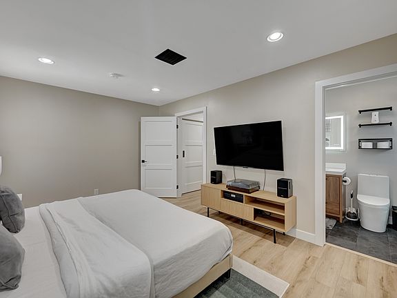 The spacious, open-concept kitchen is a chef's paradise, featuring a large island with seating, a built-in breakfast nook, and a dry bar for entertaining guests. Need a productive space? A dedicated working area with a monitor is at your disposal. The expansive living room is designed for relaxation and entertainment, featuring a 100" projector screen for movie nights or sporting events.