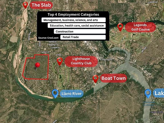Back on the market! Huge Price Reduction! Bring your offers! Once-in-a-lifetime opportunity to purchase a very large, ~363-acre, contiguous, development tract of land inside the unincorporated city of Kingsland, TX. This undeveloped tract is surrounded by housing and housing infrastructure. Water and wastewater infrastructure surrounds the property supplied and managed by Kingsland Water Supply Corp. and the Kingsland Municipal Utility District. The Lighthouse Country Club golf course is close by. The Llano River arm of Lake LBJ is within easy walking distance. There is a private airstrip just on the west side of the property. This tract is currently a blank slate as far as development. Highest and best use will require some imagination and design work, but the possibilities are endless. The property has fertile sandy loam soil and is currently covered by native vegetation, including many large oak trees and native elm, cedar, and mesquite trees. The property is presently under a 1-d-1 Ag valuation which keeps the taxes very low. Kingsland is unincorporated and is a census-designated place (CDP) with a population of over 7,000. As per the Kingsland/Lake LBJ Chamber of Commerce, Kingsland is nestled between the beautiful waters of the Llano and Colorado Rivers, and on the banks of Lake LBJ. The Highland Lakes area attracts many vacationers as well as second homeowners. The property is relatively flat and accessible. This tract has the potential to connect to Lake LBJ via a channel.