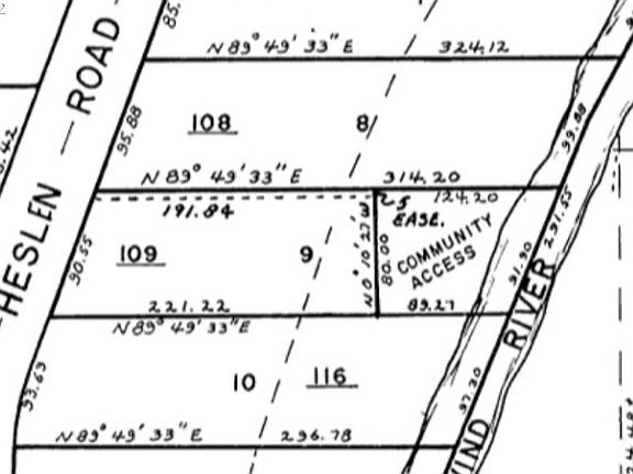 Community access on a switch back trail to the west bank of the Wind River is via a 5' wide access easement on the north side of this 0.4 acre lot (approx lot dimensions 80' wide x 200' deep). See attached enlargement of this lot boundary (zoom excerpt from the Plat Map). Mostly level treed lot right up to the bluff at the top of the community access parcel ... affording possibility of a nice patio area with overlooking views of the Wind River ... with convenient river access from your doorstep.