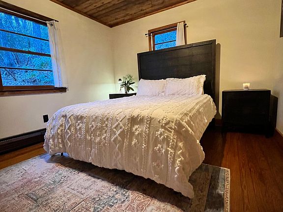 Main living area consists of 15-foot tall wood ceilings, a large wall of windows overlooking the outdoors, wood-burning brick fireplace, original pine hardwood floors, dining area, two leather couches, and small kitchen. Two recently renovated bedrooms (both queen beds with new mattresses) and one bathroom (also renovated) with rainfall shower head. Basement level consists of open space including queen bed, couch, large walk-in closet, laundry area with new washer & dryer, and full bath.