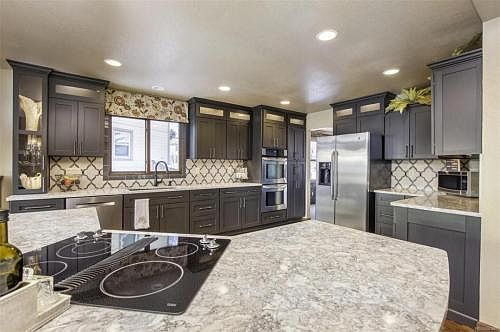 Trex deckVaulted ceilingsBuilt-in stove topStainless steel appliancesBrick fireplacePolished granite countersBreakfast nook