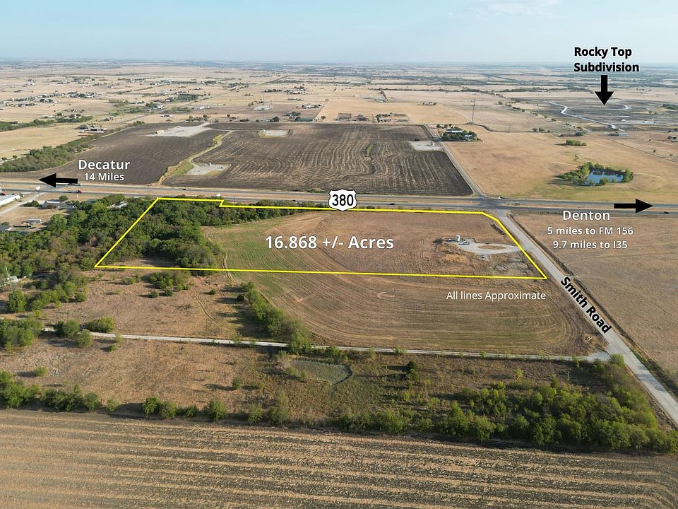 Great for commercial use. 16.868 acres on the corner of Hwy 380 and Smith Rd. Only 14 Miles to Decatur, 5 Miles to FM 156, and 9.7 Miles to I35. Partially treed. No known restrictions.
