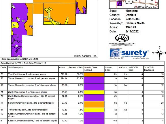 A rare offering in Daniels County- a homesteaded family-owned farm with good production, upland bird, pronghorn antelope, and deer hunting. Located in the fertile farming region of northeastern Montana sits a little over two full sections of highly productive cropland with minimal non-tillable acreage. Very seldom does a large tract of tillable acreage come up for sale in this region. This is a great opportunity for a local farmer to expand their operation or an investor looking for a return. It is currently leased as a wheat farm. This farm with gently rolling hills and coulees contains fertile type III and IV class soils covering 92% of the land.