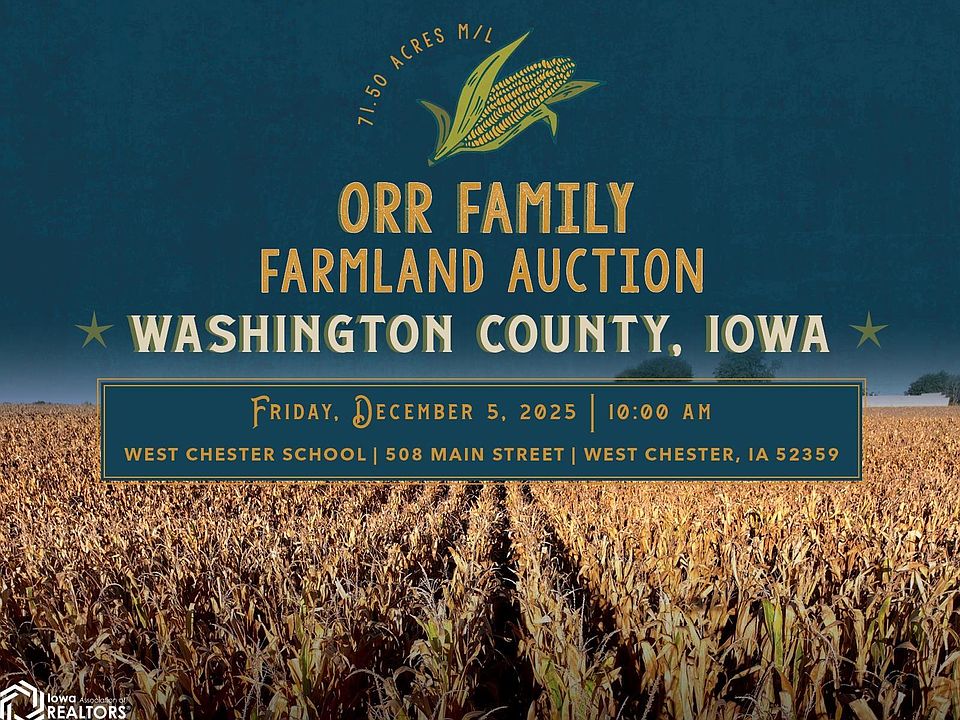 Mark your calendars for Friday, December 5th, 2025! We are proud to present 71.5 acres m/l located on the edge of West Chester, Iowa, in Washington County. The public auction will be held at 10:00 AM at the West Chester School, with live and online bidding options available. This highly productive farm includes 64.09 tillable acres m/l carrying an impressive CSR2 of 72.4. The farm lease has been terminated and will be open for the 2026 cropping season. Significant improvements were completed in 2020, including extensive tile and terrace work, making this property a top producer. With frontage along both paved IA Highway 92 and Hemlock Avenue, this tract offers excellent accessibility and versatility. It would make an outstanding building site for a home or business with highway visibility and rural appeal in a tightly held area. Located in Section 6 of Franklin Township, Washington County, Iowa, this property represents a great opportunity for a variety of buyers, whether you’re looking to expand your existing operation, acquire a manageable and efficient tract as a beginning farmer, or invest in high-quality farmland in a strong agricultural region. The farm’s prime location provides convenient access to multiple grain marketing facilities throughout the area. Don’t miss this rare opportunity to purchase a well-maintained, high-producing farm in the heart of Washington County, IA.