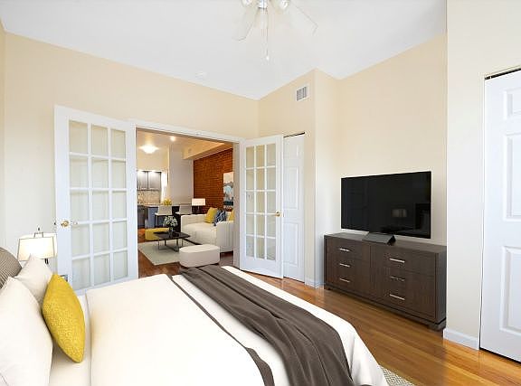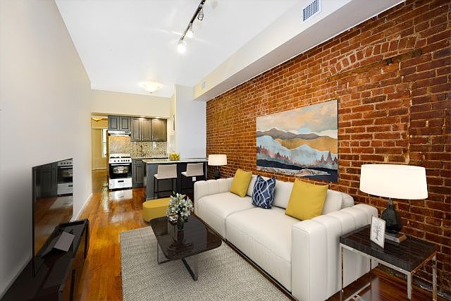 Fabulous Uptown Location modern two-bedroom apartment boasting a stunning kitchen adorned with granite countertops & SS appliances. Captivating, exposed brick in the living area, full tiled bathroom, exceptionally tall ceilings, and hardwood flooring extending throughout the apartment. Both bedrooms are equally spacious and inviting. Stay cool and comfortable with central air conditioning and enjoy the convenience of on-site laundry facilities. FEE Virtually staged. Walking distance to parks, shops, restaurants and grocery stores. NJ PREEMINENT PROPERTIES LLC LIC RE BROKER (Owner is Lic RE Agent)