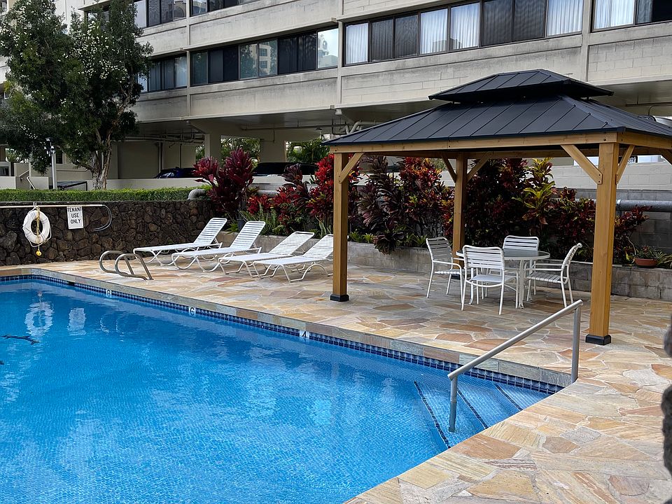 Furnished 2BR 1BA apartment on the 10th floor. Master BR has king size Tempur-pedic mattress, with storage underneath, and a full size closet with two hampers. Multi-shelf, floor to ceiling, linen closet in hallway. Office has a sit/stand desk and ergonomic chair. Unit has a smart lock to prevent accidental lockouts. Kitchen has reverse osmosis drinking water. Bathroom has a bidet and fulltime moisture exhaust vent. Base utilities such as water, electric, and trash are included. Air conditioning can be purchased from HOA, based on BTU. Cable and internet are available from third party providers. Unit has a lanai on the Mauka side. Building has 2 full size high speed elevators in the wireless FOB secured lobby. Gated pool adjacent to the building's lobby. Secured mailboxes and package lockers onsite. One year lease.