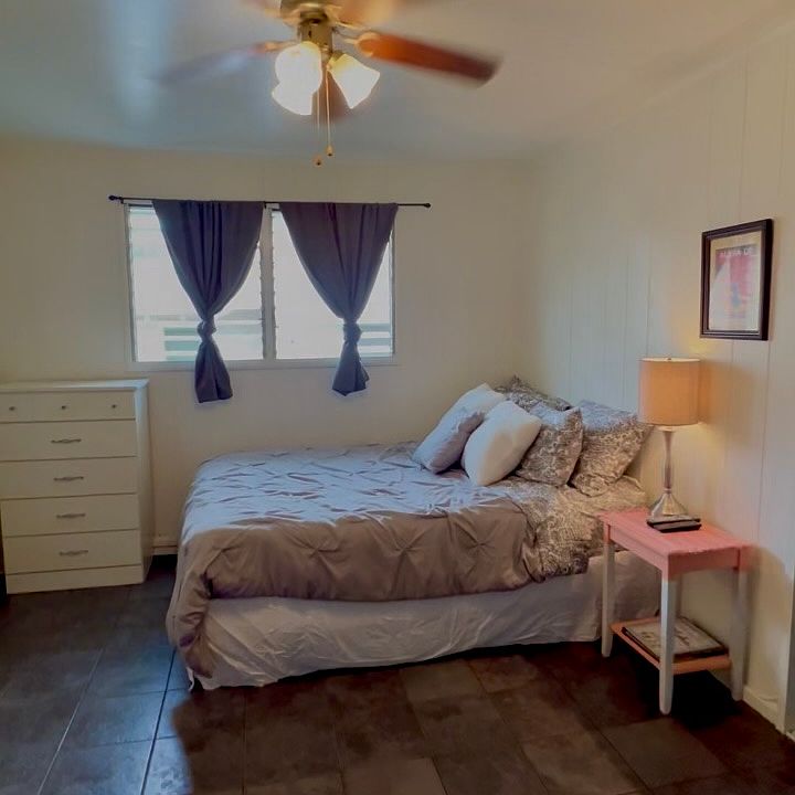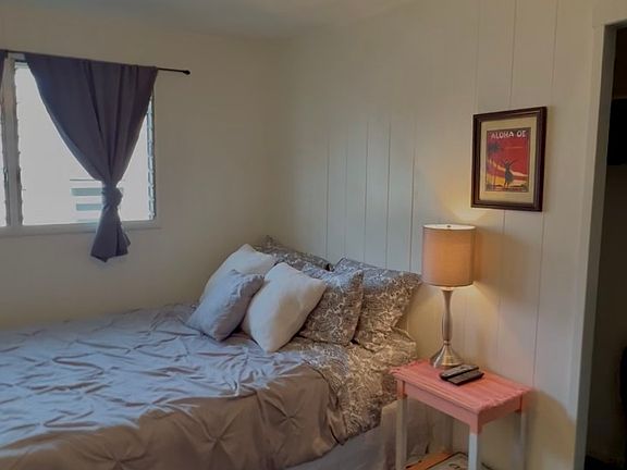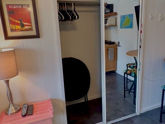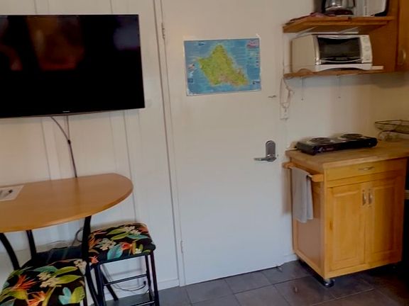 Fully furnished studio with 2nd floor entrance. Bathroom with a shower and tub. Furnishings include a full size bed, bedside table, dresser, dining table with chairs, smart tv, and more. Also, includes a refrigerator, microwave, convection oven, 2 burner cooktop, coffee maker and other kitchen items. The closet is a nice size with 2 sliding mirror doors. Additional full kitchen in the common area of the building with additional selection of kitchen appliances (juicers, blenders, fryers, rice cooker, crock pot, etc).