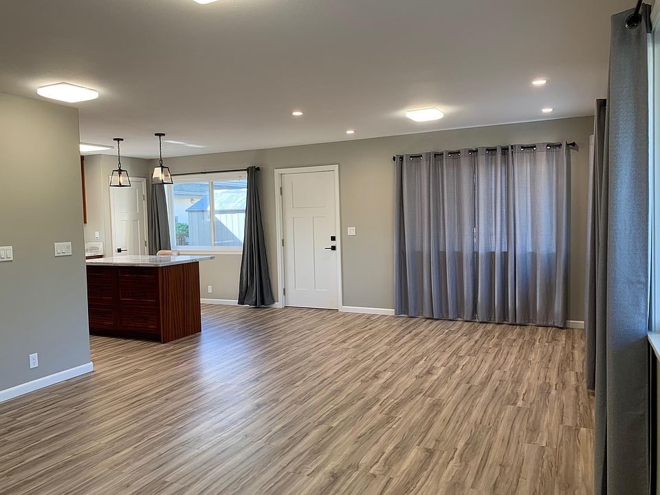 This is the 1st-floor portion of a newly built 2021 home! LVT hardwood throughout, with carpeted bedrooms and ceramic tiled bathrooms. The kitchen, dining, and living areas are an open floorplan with many six-foot windows providing lots of natural light. It comes with a stove, refrigerator, washer, dryer, and a built-in microwave (all provided as-is).