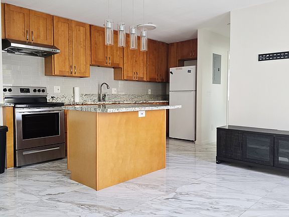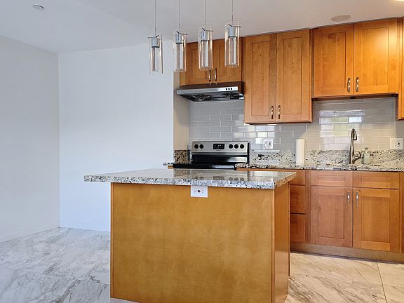 The unit features wood flooring in the two bedrooms, marble flooring in the living room, and plenty of windows for natural light. The kitchen features beautiful hanging lights and a kitchen island for all your cooking and storage needs. It offers a clean, modern living space in a quiet and safe environment.