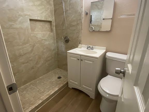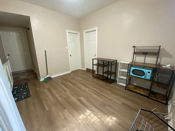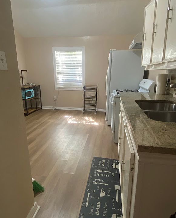 Renovated adorable 1 bed / 1 bath garage apartment. Large bedroom includes wood dresser with matching wood bed frame and box-spring (mattress not included). Kitchen includes cute mini microwave, fridge, stove, coffee bar with matching storage table and other storage items (shown in pictures). Large living room. Laminate flooring.