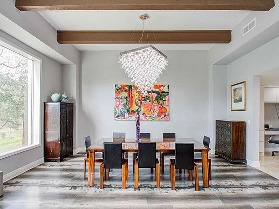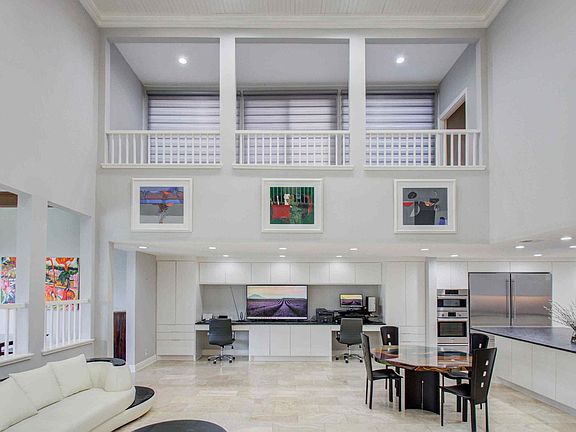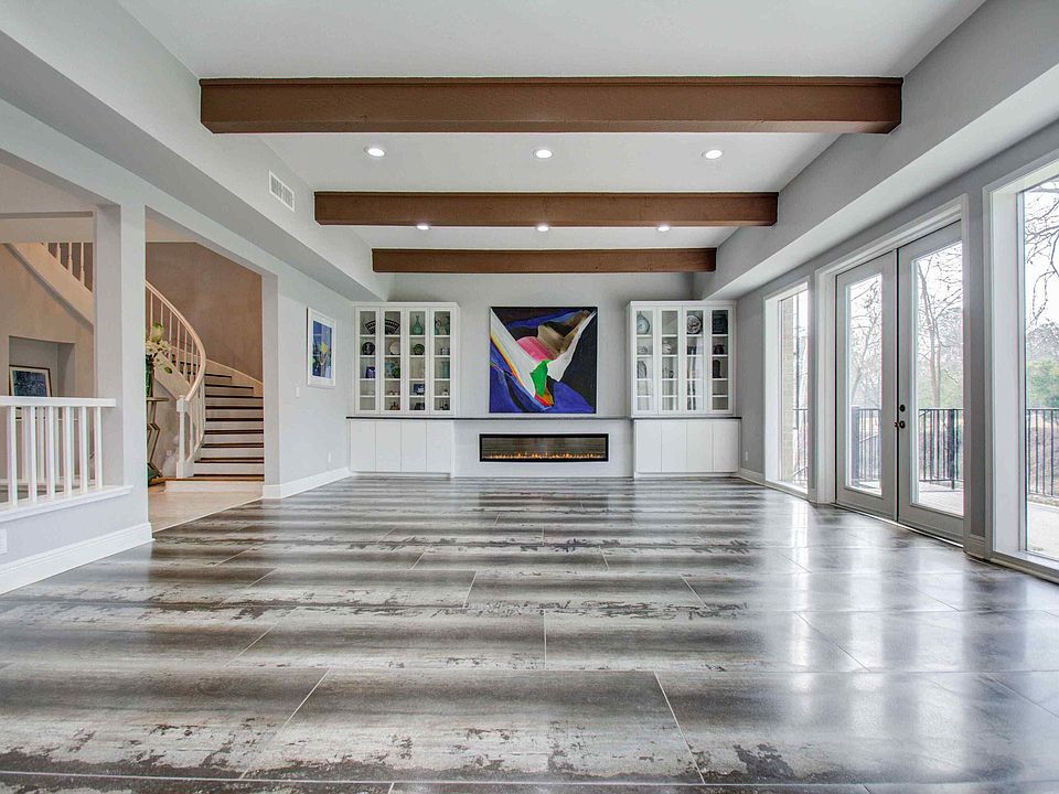 Wood floorsTile floorsOversized family roomBig glass windowsSpectacular spiral staircasePrivate streetMature trees