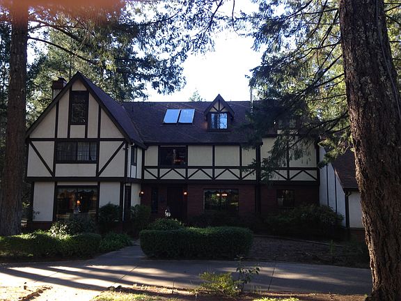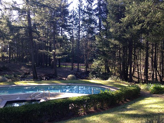 Tudor style home in a very private location. A wooded property with a one acre vineyard. Walking trails, a pool, barn and chicken coop.