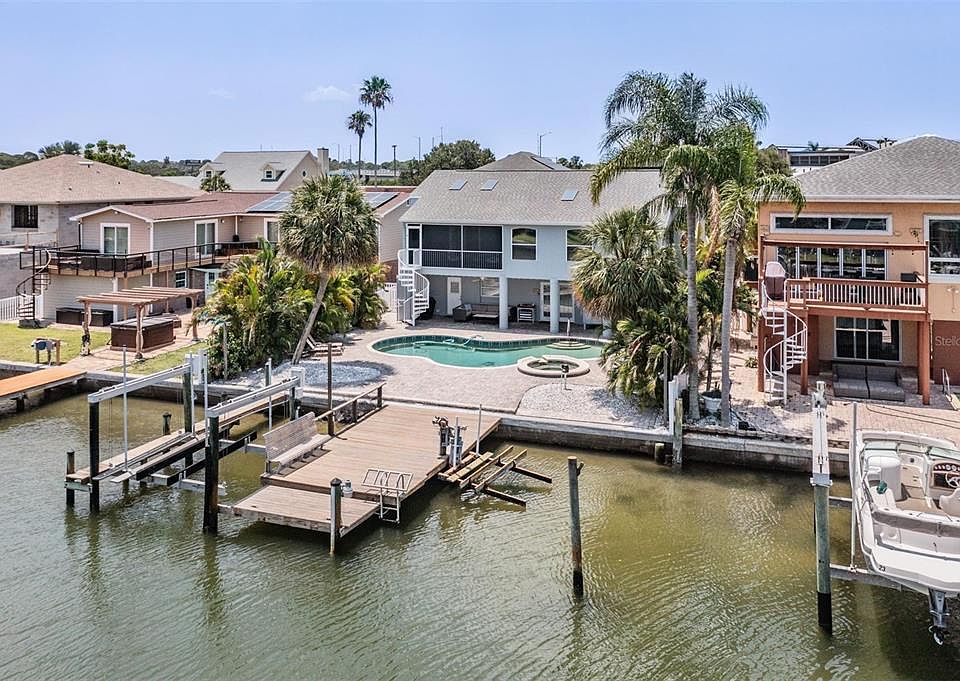 Presenting an elegantly updated, waterfront haven boasting five spacious bedrooms, three luxurious bathrooms, and nestled at the end of a highly coveted dead-end street. This prime location is a mere two-to-three-minute stroll to the pristine sandy beaches. Immerse yourself in your personal outdoor oasis featuring a generously sized, propane-heated pool and inviting spa. The exterior is further enhanced by an oversized dock, complete with a 10,000 lb boat lift - an ideal setup for marine enthusiasts. The property includes an expansive two-car garage, recently outfitted with a new hurricane-rated door to ensure maximum safety and peace of mind during inclement weather. It also boasts a new, comprehensive AC system, just installed, promising a cool and comfortable retreat from the summer heat. Inside, the gourmet kitchen has been thoughtfully updated with modern amenities, including self-closing shaker cabinets and a practical pot filler. A grand, eat-on island, hewn from stunning marble, becomes the heart of this home, perfect for informal gatherings or a casual breakfast. This is complemented by the marble countertops that add a touch of opulence to this culinary space. The property also incorporates a versatile in-law suite with its own separate entrance, providing privacy and convenience for visiting guests or extended family. All in all, this stylishly updated home, with its exquisite attention to detail and prime location, offers an unmatched coastal lifestyle. Your oasis of relaxation and waterfront entertainment awaits.