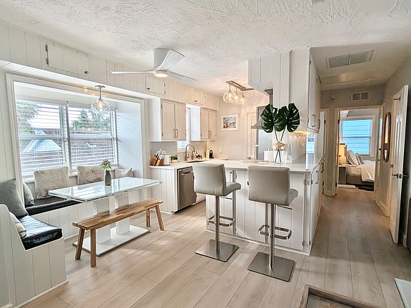 West of Gulf Blvd, this cottage unit overlooks a canopied path to the beach. A partial gulf view shows tropical foliage with sand & sparkling aqua waters at trail's end. Multiple cushy spaces are offered throughout from built-in dining, bar, living room, sitting room, to the outdoor living room on the deck.