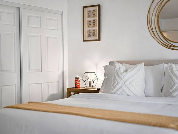This quaint 4 bedroom/3 bathroom home is located in the corner of a quiet cul-de-sac. The home boasts an open concept that connects the recently renovated kitchen, living room, and dining space. The newly renovated kitchen has stainless steel appliances and is fully stocked with all the necessary cooking pots and utensils to make you feel like you're in the comforts of your own home. There is an additional common area featuring a large sectional, smart TV, fireplace, and a stand alone bar. There is a king bed in the master bedroom and ensuite bath with french doors leading out into the side patio. The remaining 3 bedrooms have queen beds and share 2 full baths. Additionally, the sectional in the family room can be pulled out into a queen bed to sleep 2 more guests.