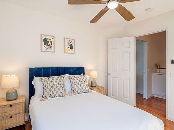 - Bedroom #1 (primary): King bed with ensuite bath, nightstands, table lamps, dresser, smart tv, walk-in closet, luggage rack, ceiling fan, private access to balcony, *upstairs