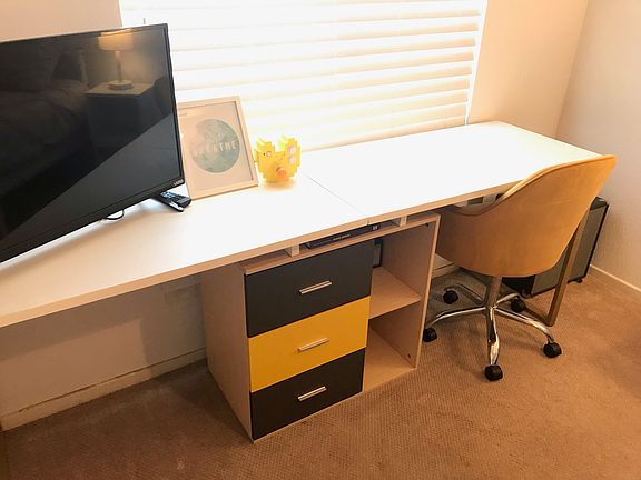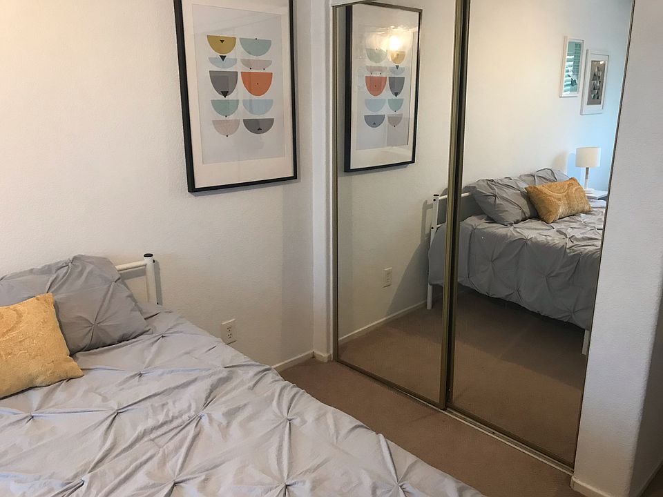 Comfortable and cheerful carpeted private room with a north facing window with great morning sunlight, brand new ceiling fan and a mirrored closet. Includes a bed, desk and a TV (can be unfurnished if you prefer). This room is located in the front of the house allowing for easy, private entry through the garage. Your room is also located close to the washer and dryer closet for your use. Just down the hall is the bathroom with shower/tub primarily available for your use. You have full access to the shared living room, kitchen, dining room and front and back yards. The backyard has a large, covered awning with ceiling fans and seating for cool, shady relaxation. The front yard also includes space where you can relax and enjoy the mountain views. You will have one spot to park a vehicle in the driveway or ample street parking. You will be allowed a small space in the garage for storage. This home is in a safe, quiet neighborhood in a non-HOA community. The location is amazing; walking distance to Hwy 111 shopping, dining and services in La Quinta/Indio and just a hop, skip and a jump from the brand-new EOS Fitness. We have one sweet and friendly dog who helps make the house a home. WiFi, Gas, Electricity (within normal usage, no high utility usage e.g., space heaters, extra A/C units, crypto mining, etc.) Water, Trash, Security system is included. Quiet, safe, non-HOA neighborhood. Perfect for a professional or student needing a peaceful home with all amenities included.