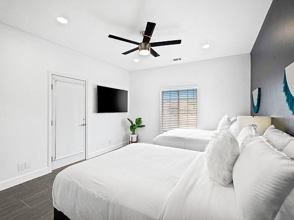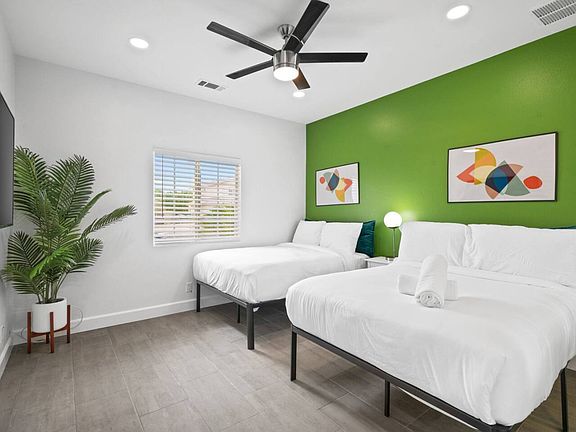 Sunset Escape has spent almost a year being renovated from top to bottom! Walls, floors, ceilings and cabinets torn down and built back up to create an open space design perfect for vacation rentals. The common space is designed to be an open kitchen concept making it ideal for large groups to hang out. The kitchen boasts an expansive island with all new stainless steel appliances. Large sliding glass doors lead out to the resort-style pool and the newly built pergola to provide shelter from the sun. The three bedrooms are spacious and can accommodate up to 10 guests with 5 total beds. The master bedroom has a sliding glass door leading out to the yard, as well as one other bedroom with a private door.