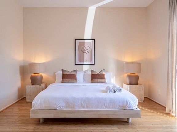 - Bedroom #2 (secondary): King bed, ensuite bath, smart TV, nightstands, sconces, walk-in closet, luggage rack, ceiling fans, private access to backyard