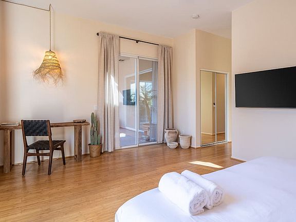 - Bedroom #1 (primary): King bed, ensuite full with separate tub, nightstands, table lamps, smart TV, dedicated workspace, ceiling fan, walk-in closet, dresser, luggage rack, private access to backyard