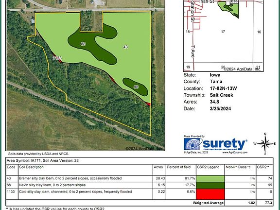This is a unique recreational farm located just east of Chelsea along a hard-surface road. It provides a nice return along with recreational benefits from the timber and CRP. There are five CRP contracts on this farm totalling $9,389 annually: 18.30 acres enrolled in a CP38E-2 contract with a payment of $261.05/acre, $4,777 annually, which Sept. 30, 2036. 4.70 acres enrolled in a CP38E-2 contract with a payment of $242.05/acre, $1,138 annually, which expires Sept. 30, 2036. 1.20 acres enrolled in a CP21 contract with a payment of $314.48/acre, $377 annually, which expires Sept. 30, 2024. 5.60 acres enrolled in a CP21 contract with a payment of $319.39/acre, $1,789 annually, which expires Sept. 30, 2024. There are 5.00 acres enrolled in a CP23 contract with a payment of $261.60/acre, $1,308 annually, which expires Sept. 30, 2025. Primary soils are Bremer and Nevin. CSR2 on the CRP acres is 77.30.