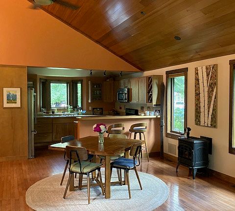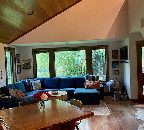 2 bedroom 2 bath w master walk in closet, open floor plan with vaulted ceilings. kitchen peninsula with seating for 3. dining area ,gas stove, living room. W/D mudroom, 2+ car garage office nook fenced yard, pet negotiable.