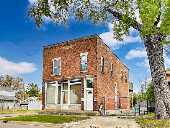 Two-story house situated on a corner lot with a fenced yard. The exterior features light-colored siding with a pitched roof and multiple windows on both levels. A concrete walkway leads to the main entrance, and an asphalt driveway provides parking. The property has a modest front lawn with mature trees and a visible side yard extending along the corner.