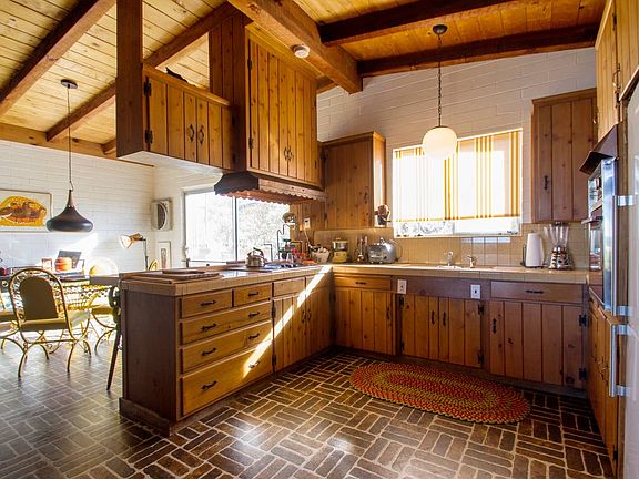 This is a true Mid-Century Modern house built in 1959 situated on a paved road with nice views of the mountains to the south. It is just 4 miles from the Joshua Tree National Park west entrance within walking distance to the village of Joshua Tree. The house is being rented fully furnished. It features a huge indoor fireplace faced in lava rock, the original knotty pine kitchen, bar counter, Roku TVs, and awesome stereos/records, fast wifi, and central heat & AC. The private side yard features a covered outdoor dining area & mature pines, pepper trees, aloe, new seating, an outdoor fireplace, & amazing desert views.