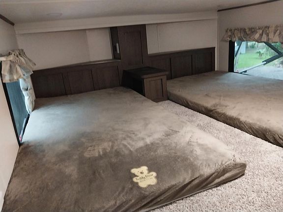Master bedroom has a queen bed, loft has 3 single beds, full size couch is a pull out bed.