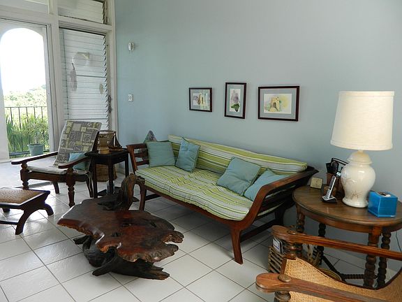 Fabulous condo. Best location. Best floor plan. Living area w/spacious gallery + spectacular town & harbor views. Bedrooms lower level with private patio onto lawn. Indoor atrium adds tropical style. LR has high ceilings, built in bookcase. Updated kitchen, lots of storage. Master bath redone, handicap accessible features. 83 unit hilltop community near Christiansted.