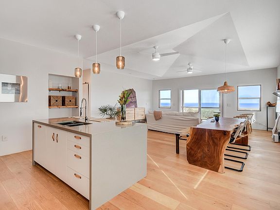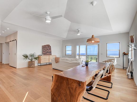 Modern masterpiece calling all nature lovers! Ocean views from every room for days! This tropical beauty boasts one of the most spectacular and one of a kind views on the island, truly unique and unbelievably relaxing. The tranquil setting of coffee fields on the horizon adjoining into glistening ocean will awaken your senses!! This designer's flawless interior design choices will be appreciated and enjoyed, truly a spa like experience living in this sanctuary. Glass sliders run the length of the living + Master bedroom. High cathedral ceilings, open floor plan and nature inspired finishes/ stone/ onyx throughout. Impeccably designed kitchen featuring island. En Suite Primary Bedroom features a slider door to front lanai, enjoy ocean breeze when waking up and staring at the sea.