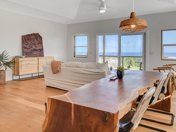 Master bath suite features luxurious one of a kind designer stone tile, stone counters, all-tiled open walk-in shower with Rain shower head. Guest bath features a modern soaking tub with minimalist design floor to wall wood. Guest bedrooms 2 and 3 are currently decorated as office and yoga studio with convertible bed furniture. Laundry area located in hallway to bedrooms. Seamless design makes this oasis free of clutter and a minimalist haven. Keyless locks installed throughout. Tastefully designed with a full 800 SF wrap around covered lanai, picture perfect hangout for dinners or remote work outside with view, view and more view. This nature inspired beauty is a must see and truly a prime, secluded location away from it all; yet just a few min drive to beaches, shopping, golfing and entertainment. Centrally located within a short drive to PMRF and Lihue. Live the real dream!