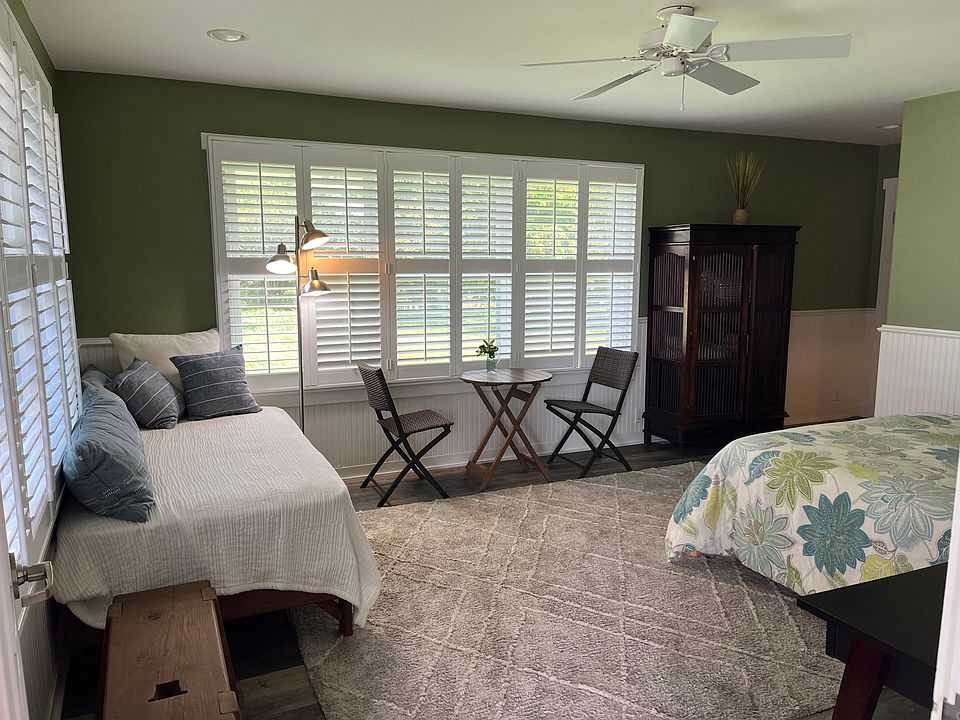 Furnished clean and airy studio for 1 person, separate from the main house (where we live), but connected by a covered walkway. The studio is quiet and comfortable, with a view of the Kohala Mountains. Comes with a king bed, a twin size daybed, a small table, a small fridge, a butcher block stand with a microwave, a toaster oven, an electric kettle, a french press, plenty of windows, and blinds that almost blackout the room. Our studio does not have a full kitchen and is not ideal for people who cook a lot. Parking for one car on site & a washer/drier.