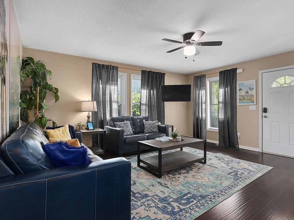As soon as you enter you'll see an open kitchen with a large island and barstools. The kitchen is updated with modern countertops and stainless steel appliances. The vibrant living room has modern decor / furniture and a large smart TV. It's a home away from home atmosphere