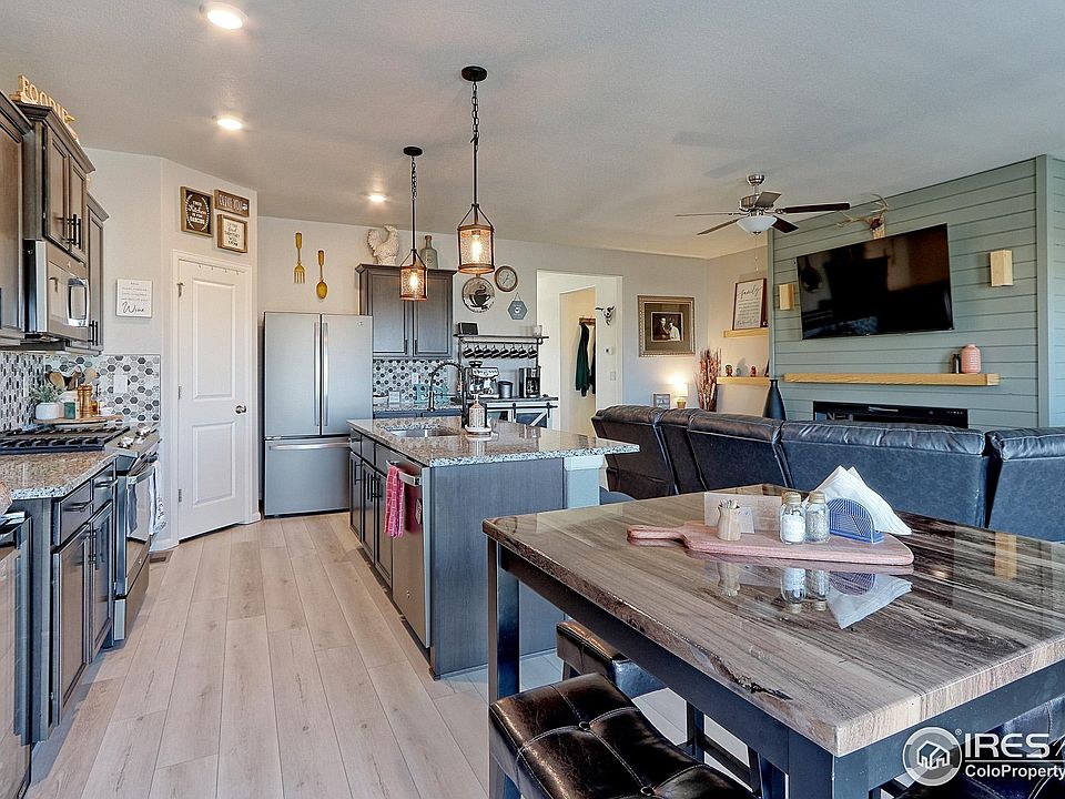 Just 16 miles northeast of Brighton, discover this stunning ranch style home in the peaceful town of Keenesburg. Built in 2020 and thoughtfully upgraded throughout, this home blends modern comfort with custom touches you'll love. Step inside to find wood look laminate flooring flowing through most of the main living areas, with plush new carpet in the two secondary bedrooms. The kitchen shines with updated stainless steel appliances, granite countertops, a full tile backsplash, and plenty of space to cook and entertain. The highlight of the family room is a custom-designed fireplace and entertainment wall, soaring from floor to the 9-foot ceilings, both functional and beautiful. The spacious primary suite features a dream bathroom and large walk-in closet, creating the perfect retreat. Outside, enjoy a 19'x16' patio wired for a hot tub, a fully fenced backyard with raised garden beds, and an extra concrete pad with a walkway that connects to the front of the home. The two car garage is fully finished with hot and cold water hookups-ideal for a dog wash or easy car care. This move-in ready home offers smalltown charm, thoughtful upgrades, and modern convenience all just a short drive from Brighton or the Denver Metro area and is priced to sell quickly.