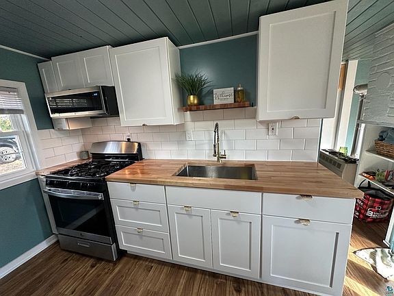 This cozy one-bedroom cottage features a brand-new classy kitchen with butcher block countertops, under-cabinet lighting, subway tile backsplash, and soft-close cabinets. New LVP floor seamlessly runs through the living space. The updated bathroom includes a modern vanity with additional storage options. There are ample storage options throughout the home. The enclosed front porch is a great option to kick off your boots and hang your hat. The property boasts beautiful perennial gardens, black-eyed susans, hostas, lilies, and phlox. The spacious property offers ample off-street parking, a campfire pit, and partially fenced yard that is perfect for your backyard activities. Just 10 minutes from I-35 in Moose Lake and 15 minutes from Barnum. The property sits on a paved road in the heart of town. Price based on appraised value. Seller has decided to set an offer deadline for May 14th at 1pm. We recommend you set your highest and best offer by then.